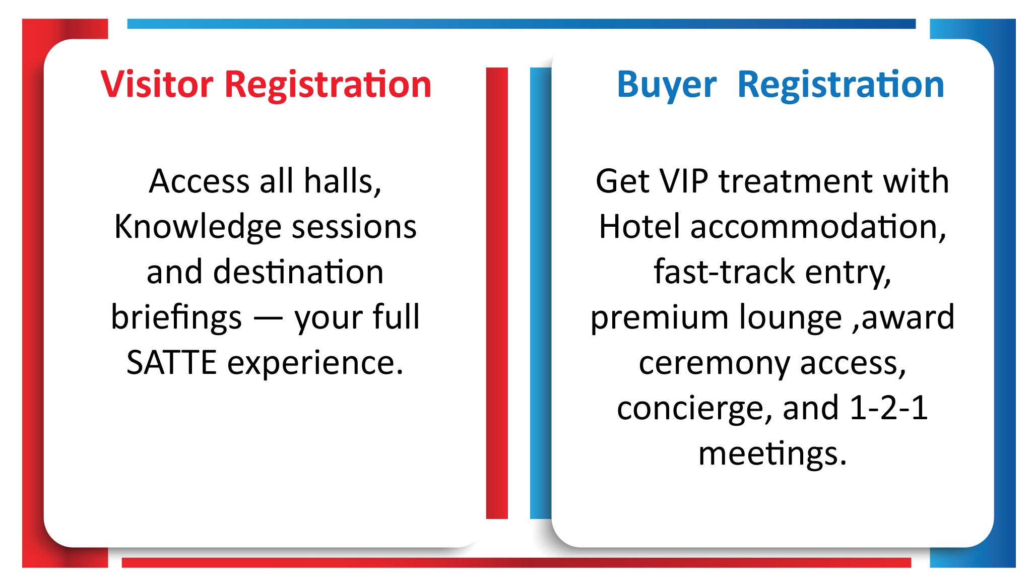 Register online now to secure your pass and guarantee seamless entry into the travel trade's most influential gathering. Skip the queues and unlock curated experiences with targeted networking, exclusive tourism insights, and enhanced business opportunities—all configured before you step foot at the venue.